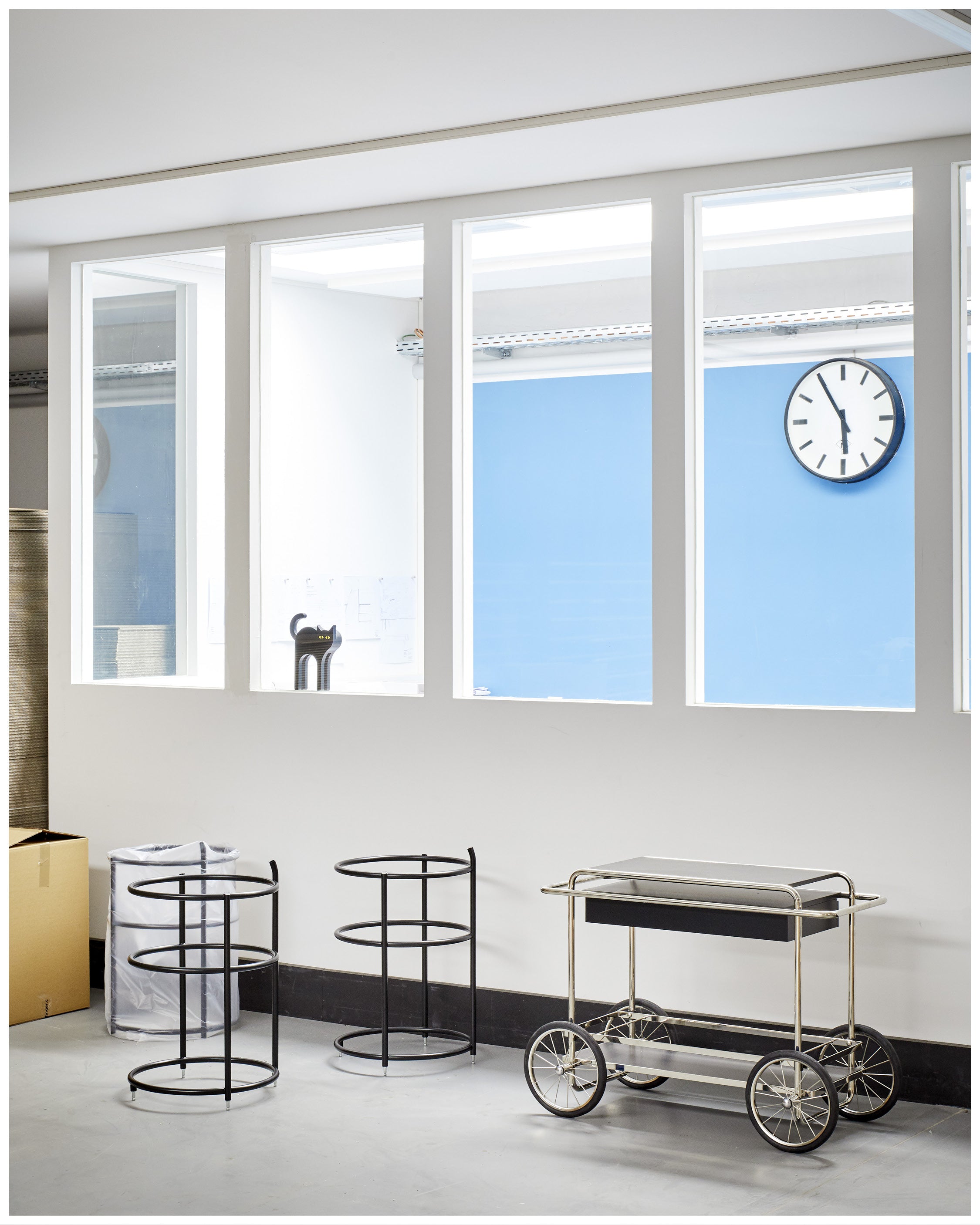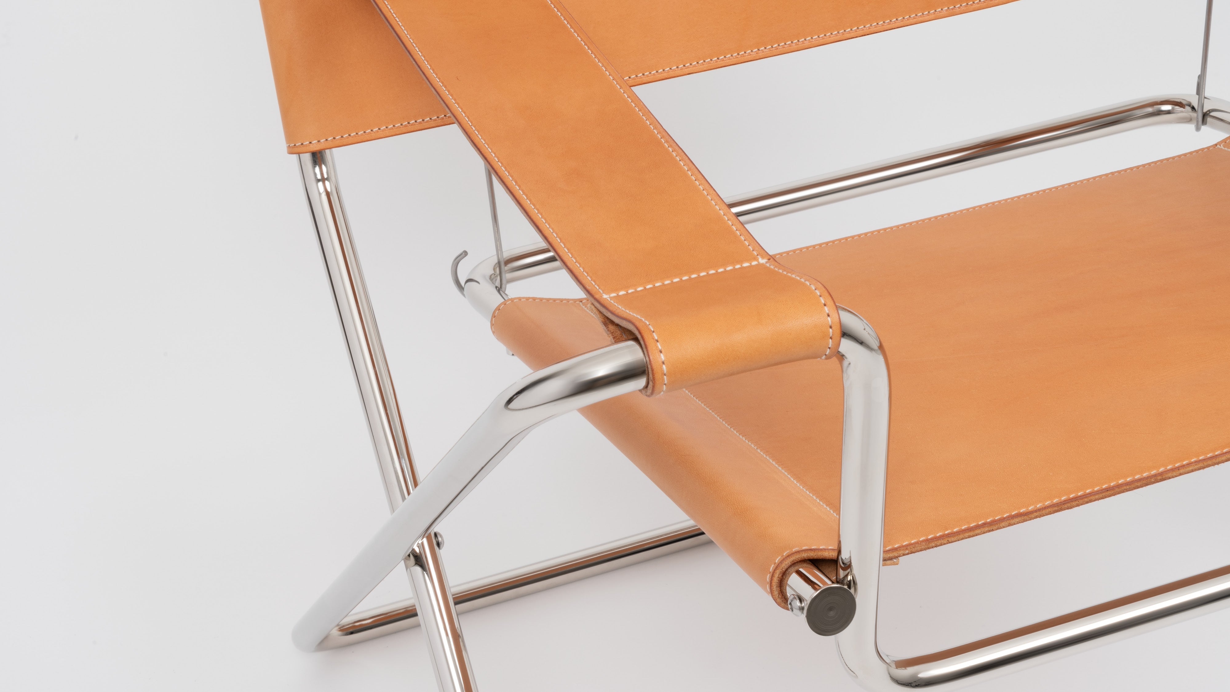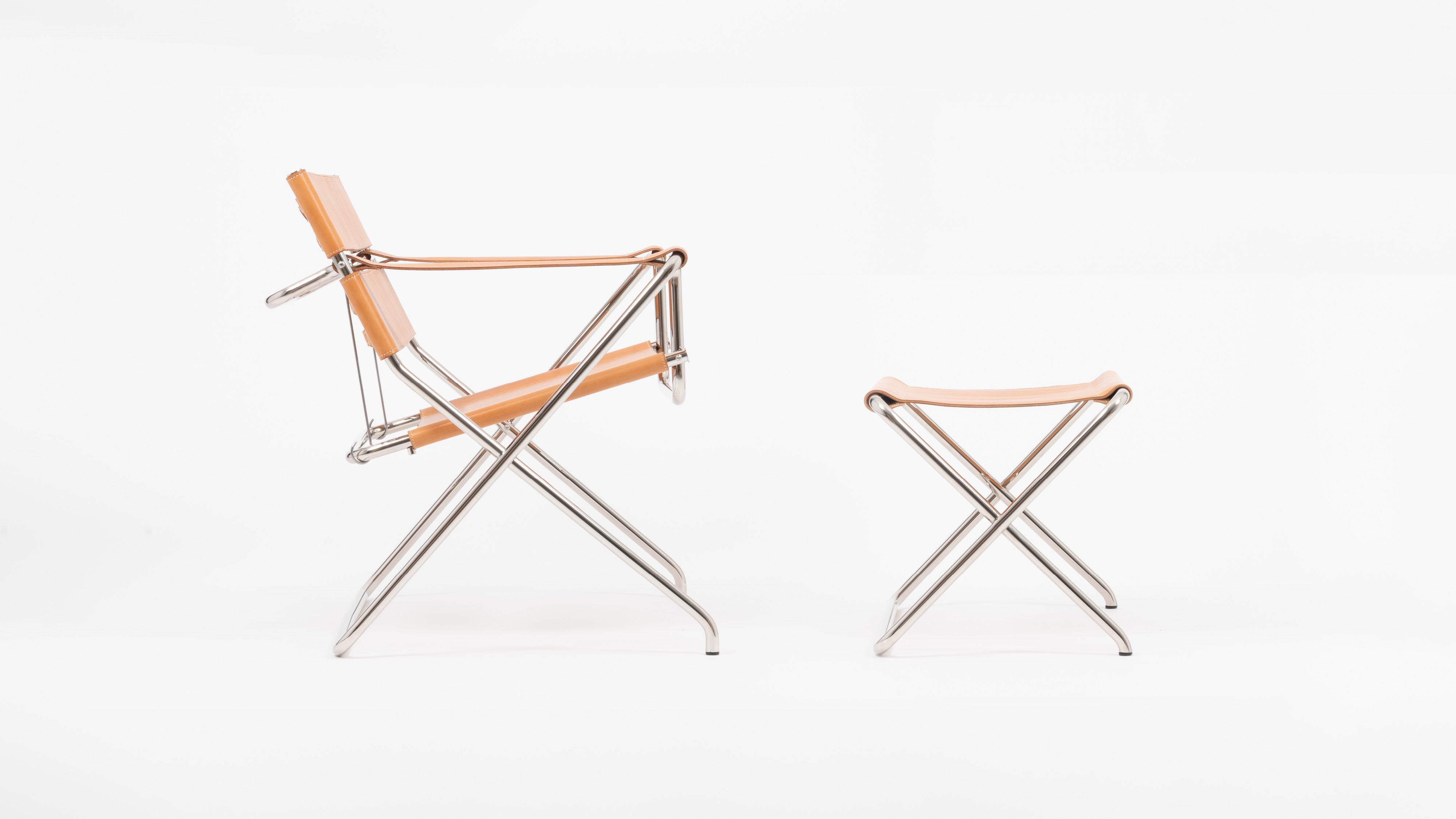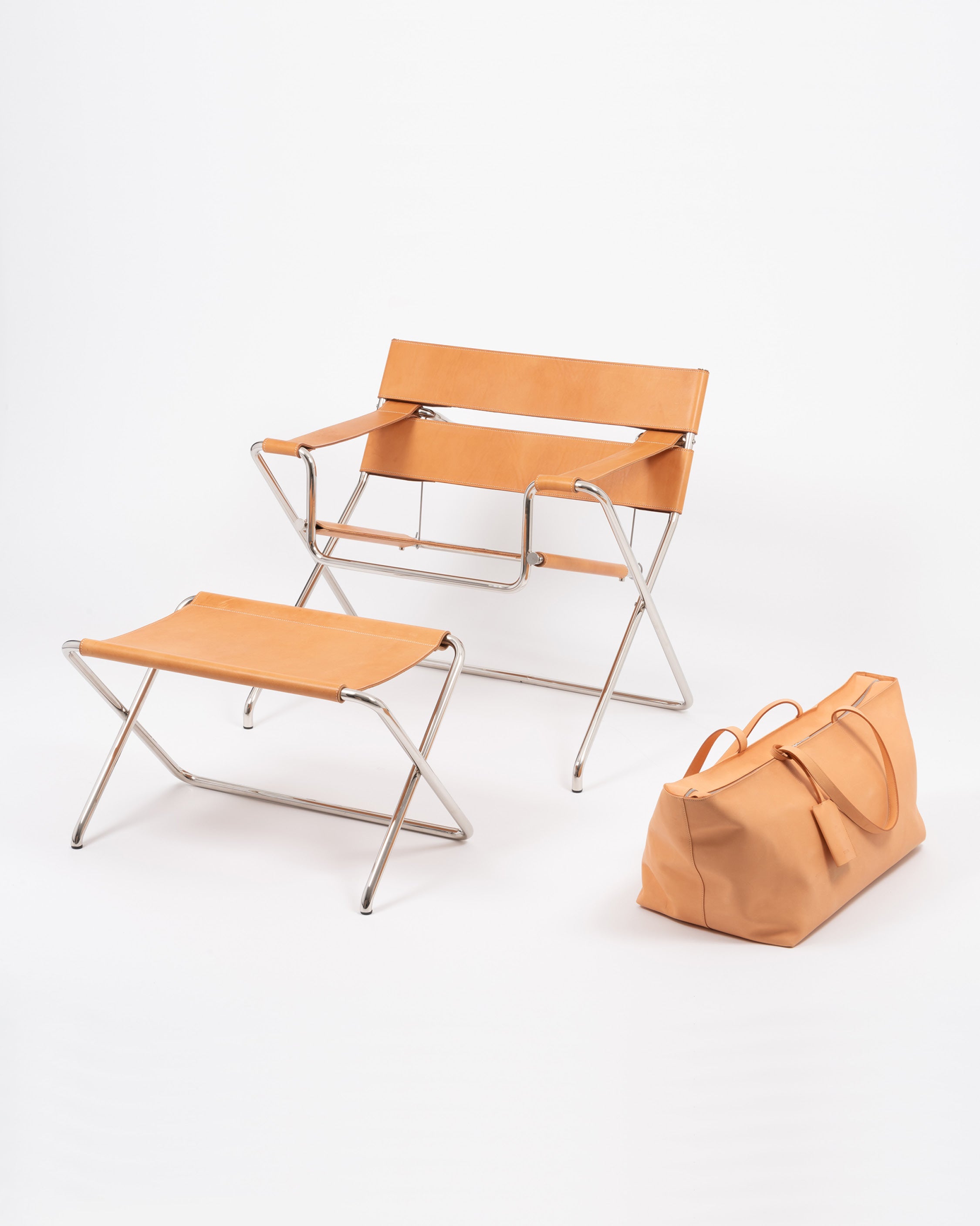 Alle drei Objekte verbinden eine außergewöhnliche Lederqualität. Ein sehr natürliches und lebendiges Leder wurde ausgewählt, das wunderschön altert und im Kontrast zum harten, warm glänzenden Stahlrohr steht. Das Ensemble ist aus der gleichen Naturlederqualität gefertigt. Das war eine Herausforderung, denn die Tasche ist mit etwa 1,5 mm Leder dünner und geschmeidiger, während Sessel und Hocker ein dickeres, 3,5 mm starkes Material brauchten.