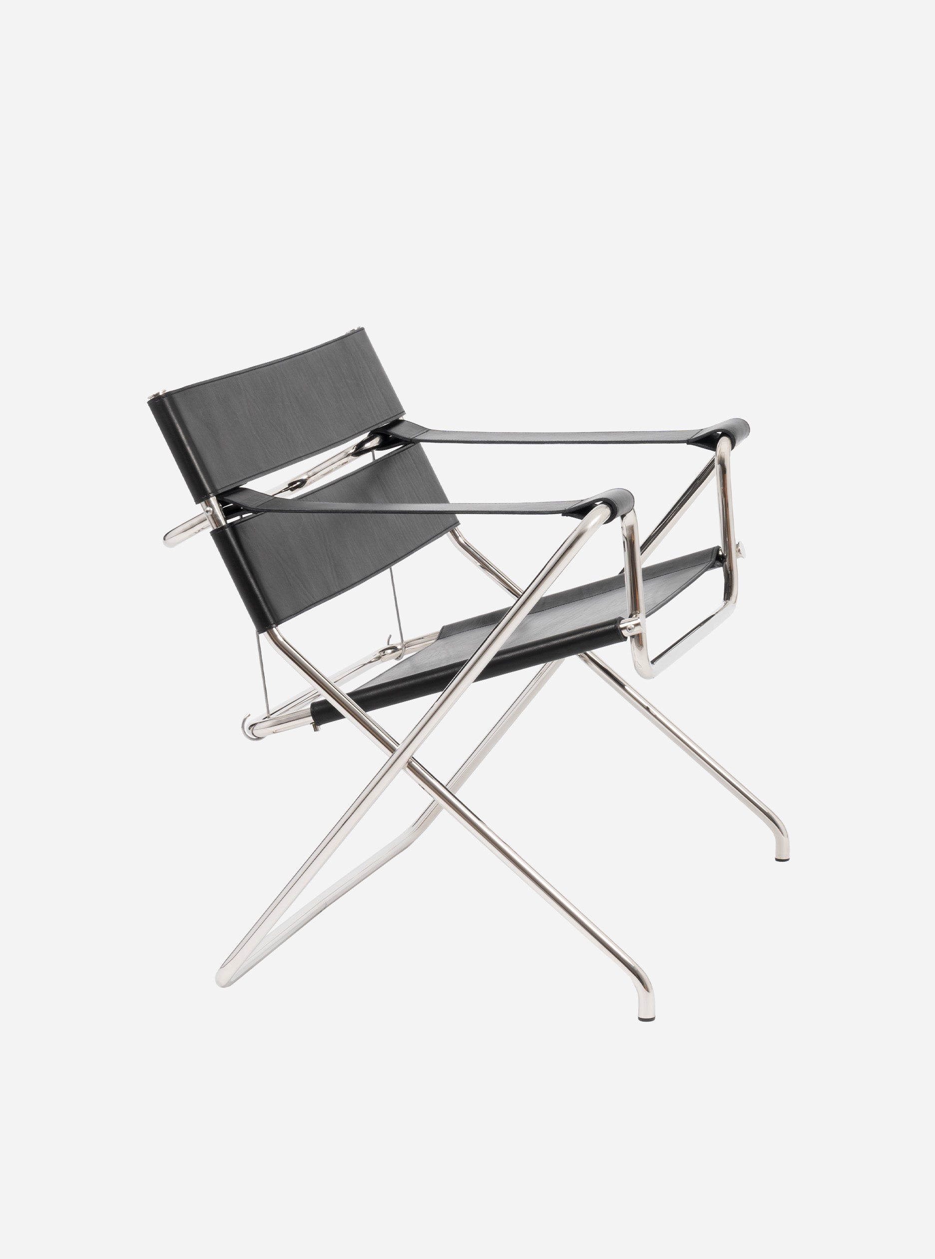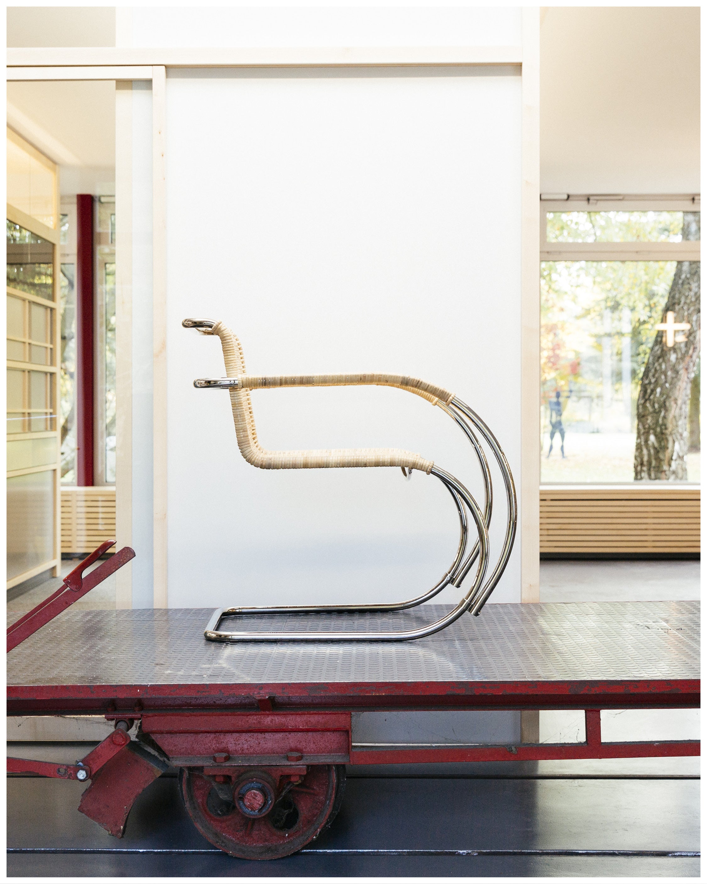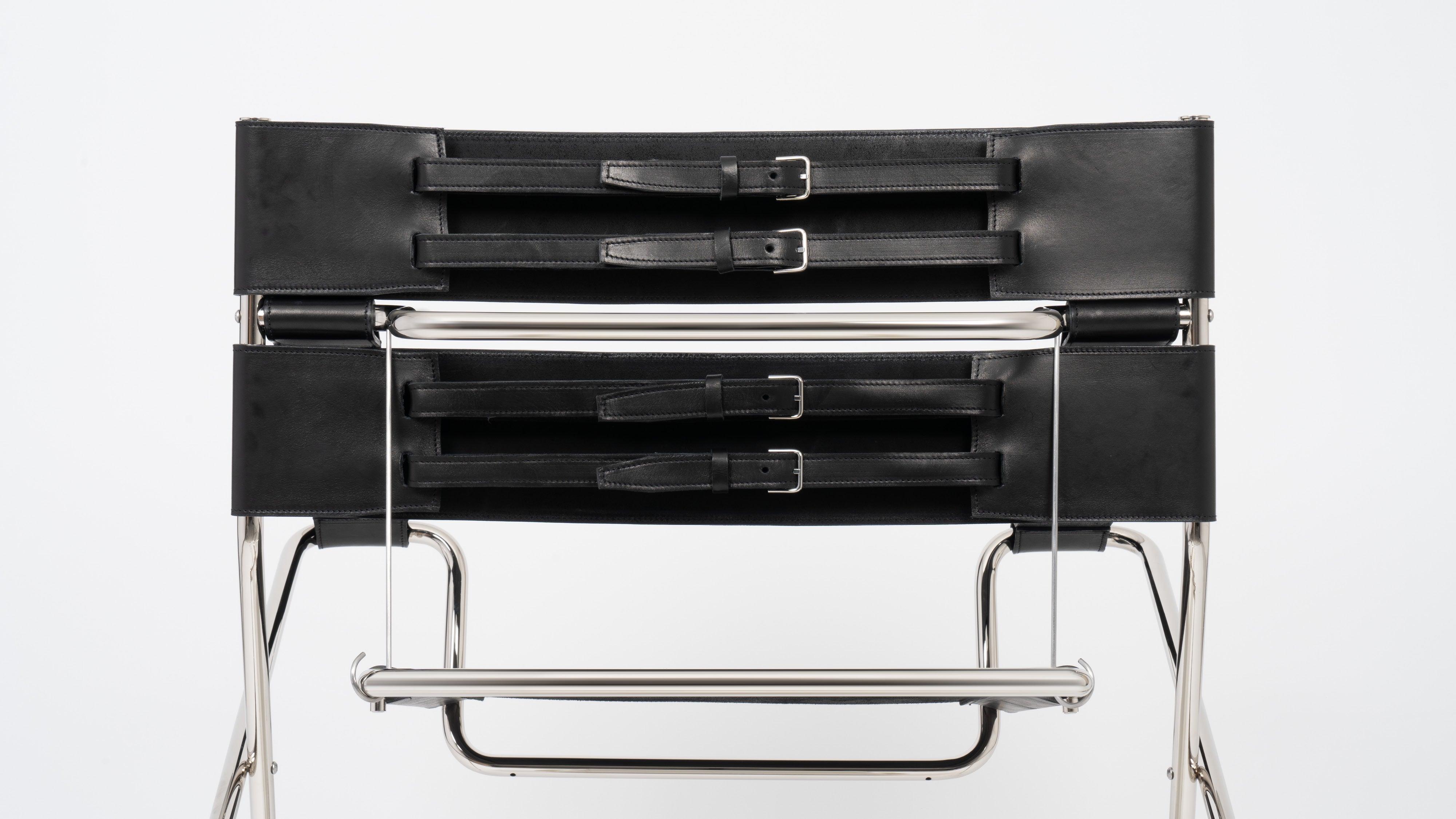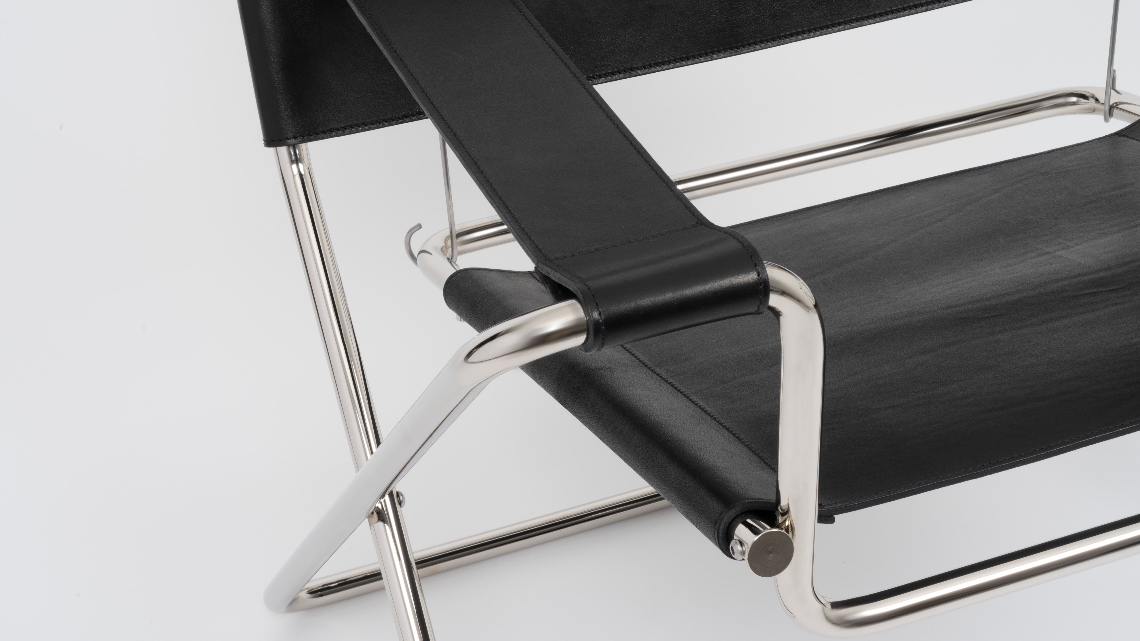 Der D4 von Marcel Breuer hat meine Aufmerksamkeit sofort geweckt. Sein zeitloses Design, das auch fast 100 Jahre später noch bemerkenswert modern und leicht ist, wird aus nur zwei Materialien hergestellt: Stahlrohr und Stoff oder Leder. Er wird in Deutschland hergestellt, ist leicht zu reparieren, platzsparend und für mich ein herausragendes Beispiel für Nachhaltigkeit. Die Designerin Ayzit Bostan hat den Bezug der Rückenlehne mit Elementen aus der Kollektion PB 0110 neu gestaltet.