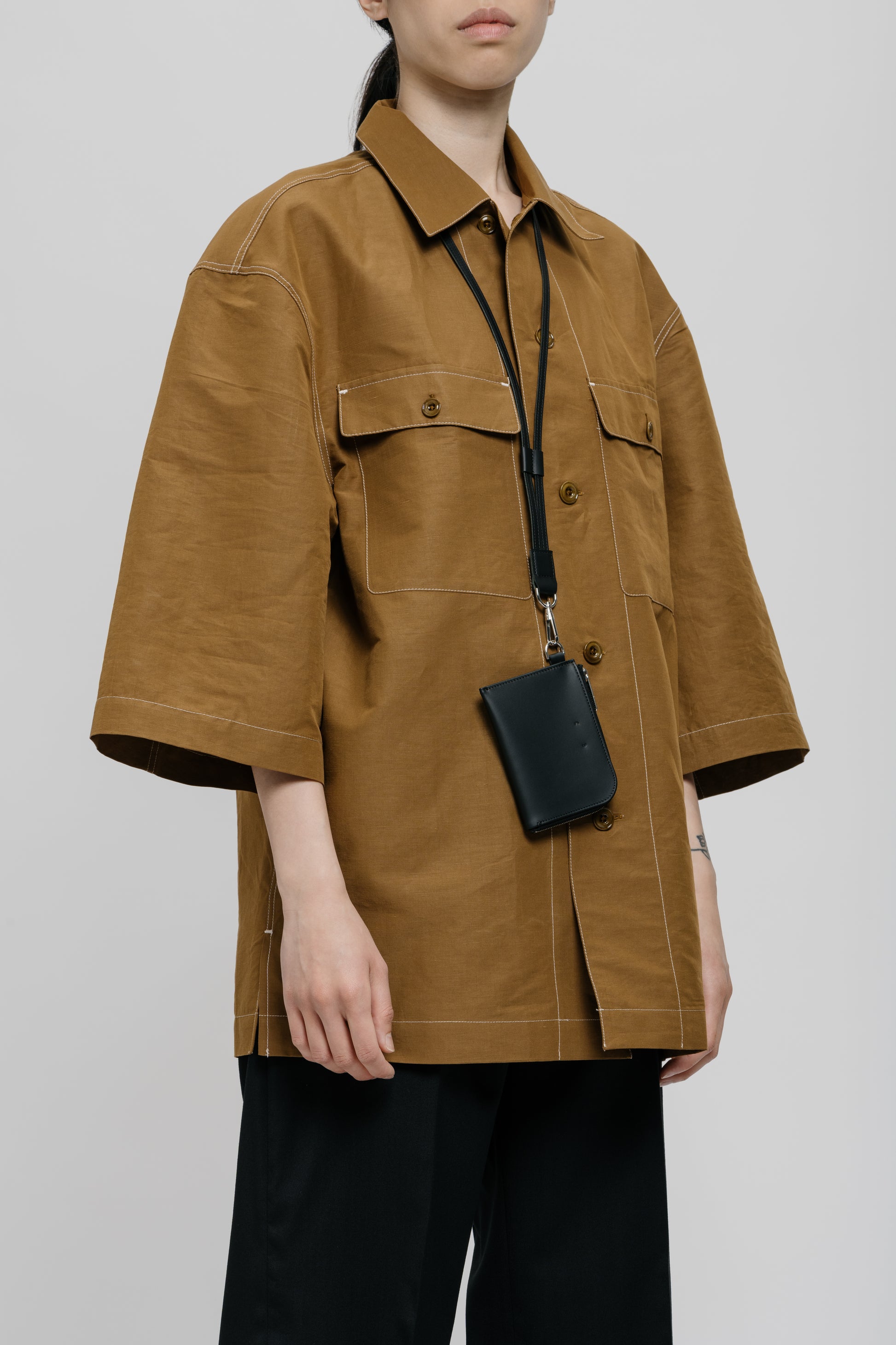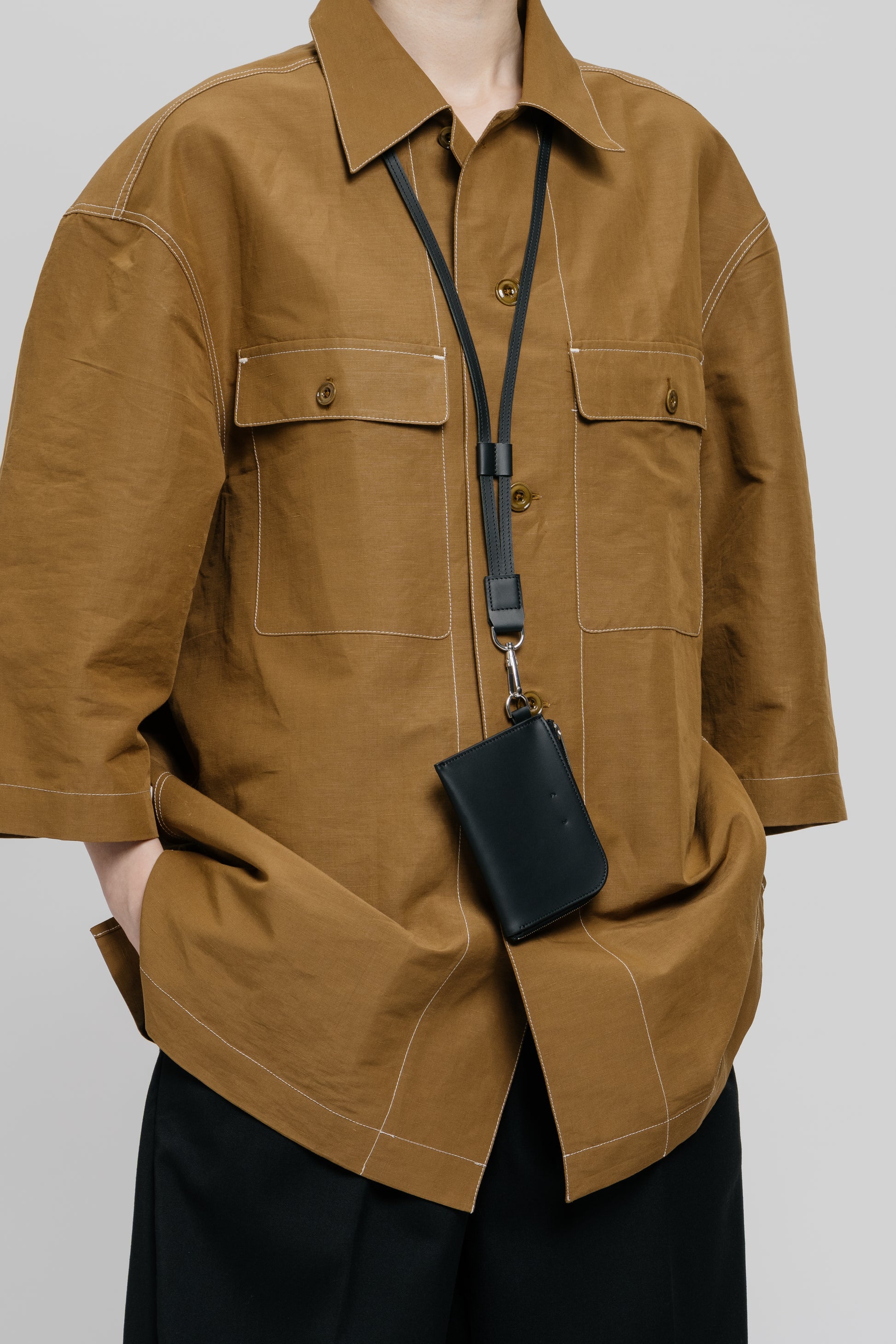 One inspiration for the ensemble of products that can be worn very close to the body is certainly the realisation that the mobile phone is moving ever closer to us in many respects. One could get the impression that it is becoming a new limb. If this is the case, we would like to offer a beautiful, restrained form that also integrates a wallet.