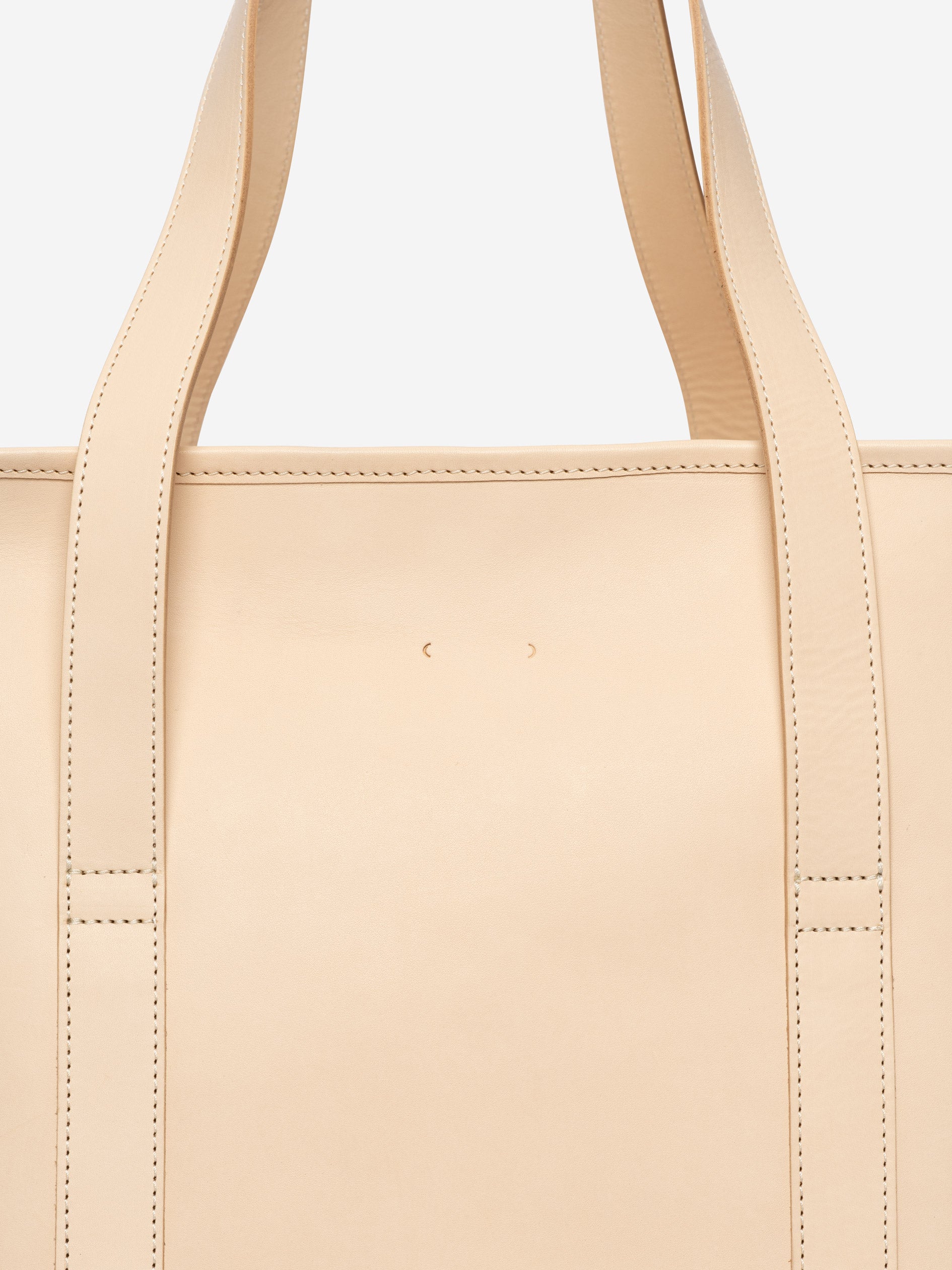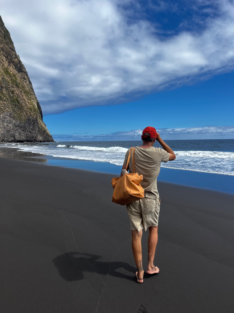 The balanced strap length ensures PB 1 is comfortable to carry in any state. Material and Craftsmanship Made from 1.1 m² of soft, vegetable-tanned leather, PB 1 reveals the natural beauty of the material over time. We deliberately omitted a lining to reduce weight. The reverse side of the leather is specially treated to maintain a smooth, refined surface. Protective piping along the edges adds structure and ensures durability.